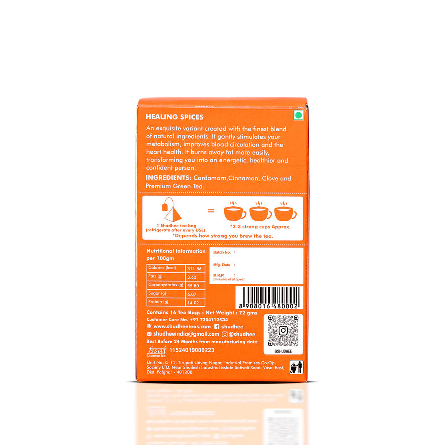 INGREDIENTS: Cardamom, Cinnamon, Clove and Premium Green Tea.